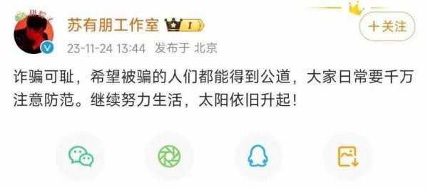 就在前两天,苏有朋工作室突然发微博怒斥“诈骗可耻”,并叮嘱大家“日常要千万注意防范”。