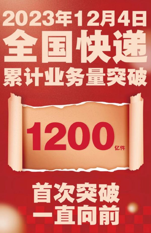 12月4日18时26分,随着一件从云南昆明寄往四川成都的快递包裹送出,我国快递年业务量首次突破1200亿件大关,成功打破历史纪录。