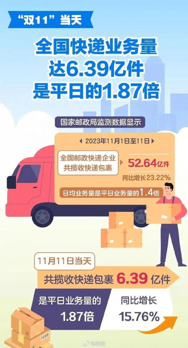 在万众瞩目的双11期间,我国快递单量持续飙升,仅11月1日至11日,全国快递企业揽收快递包裹达52.64亿件,同比增长23.22%,日均快递业务量超4.3亿件,是平日业务量的1.4倍。在11月11日当天,快递企业揽收快递包裹为6.39亿件,是平日业务量的1.87倍,实现同比增长15.76%。