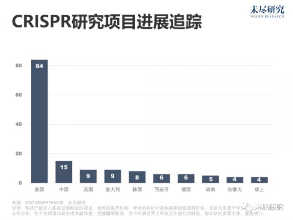 统计研究期刊、预印本和公司公告,目前,全球近百项涉及CRISPR疾病治疗应用的重要研究正在进行或已经结束。美国占了绝大多数,中国居于第二。据药明康德统计,全球十余款由企业推动的基因编辑,也进入了临床试验阶段。中国的博雅辑因、邦耀生物、瑞风生物,同样瞄准地中海贫血。在中国,约30万人罹患该病,且病程严重,主要位于两广地区。本导基因与中因科技主要聚焦于眼部疾病。