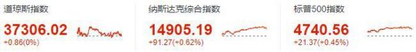 道琼斯收于37306.02点,上涨0.86点,创历史最高收盘点位,并连续第八个交易日上涨;标准普尔500指数收于4740.56点,涨幅0.45%,创2022年1月4日以来的最高收盘点位;纳斯达克指数收于14905.19点,涨幅0.62%,连续第八个交易日上涨,创2022年1月12日以来的最高收盘点位。