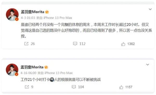 孟羽童曾经公开表示,自己连轴转没有休息,辛苦挣得月薪不过同级应届生的水平, 24小时随时待命,996不堪重负……话里行间的职场“真实”早已埋下了“离开”的伏笔。