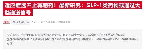 举个最新的案例,根据财联社此前报道,医学期刊《细胞代谢》本周刊登了一篇论文,研究人员描述称,GLP-1受体激动剂能通过改变患者的大脑信号,来帮助控制全身炎症。