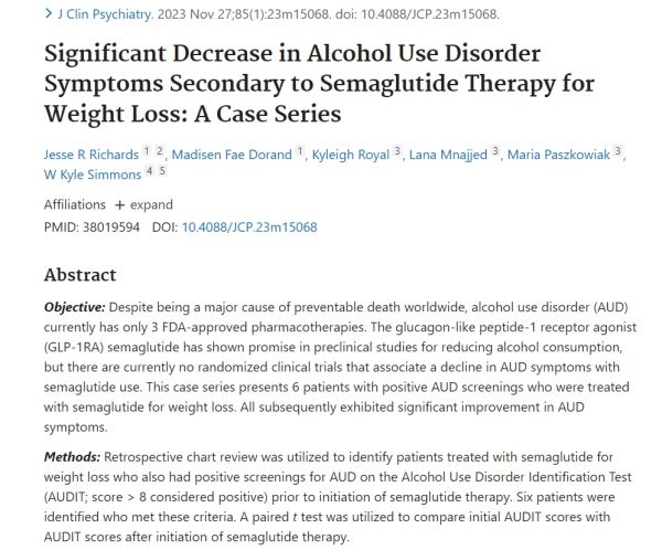 一项迷你研究显示,使用司美格鲁肽减肥的6名肥胖症患者,在服药的1-9个月内饮酒量均大幅减少。还有一项以白人女性为主的网络调查也显示,使用司美格鲁肽后饮酒量明显减少。