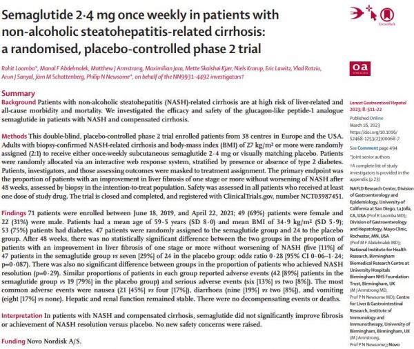 由诺和诺德赞助的一项研究发现,相较于安慰剂,司美格鲁肽无法显著改善肝纤维化以及非酒精性脂肪肝炎(NASH)。