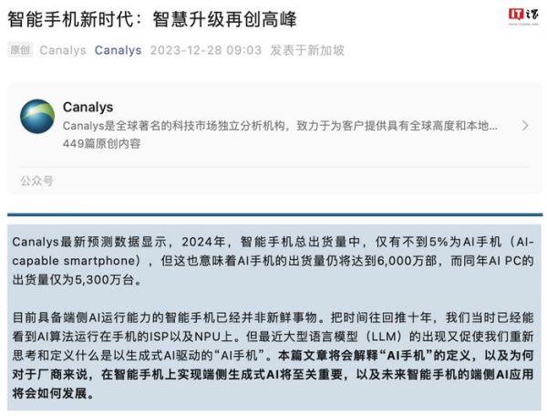 Canalys:手机是AI的重要载体,明年相关设备出货量达 6000 万部