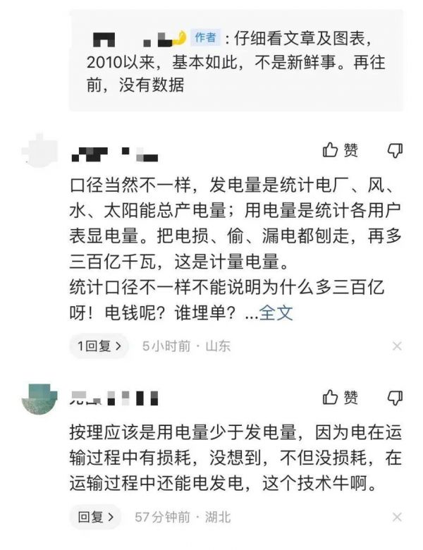 也有一部分网民认为,这是“用电量和发电量在发布时没有统一口径”造成的。