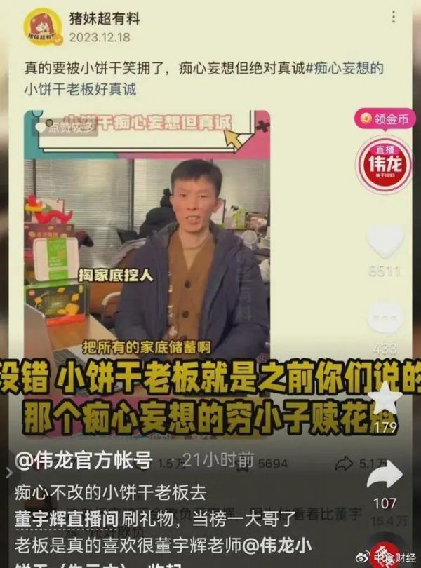 在与辉同行热度不断上升同时,曾经说要掏空家底“挖”董宇辉的伟龙小饼干再次成为“显眼包”,其公开表示,旗下一款产品想进与辉同行直播间。