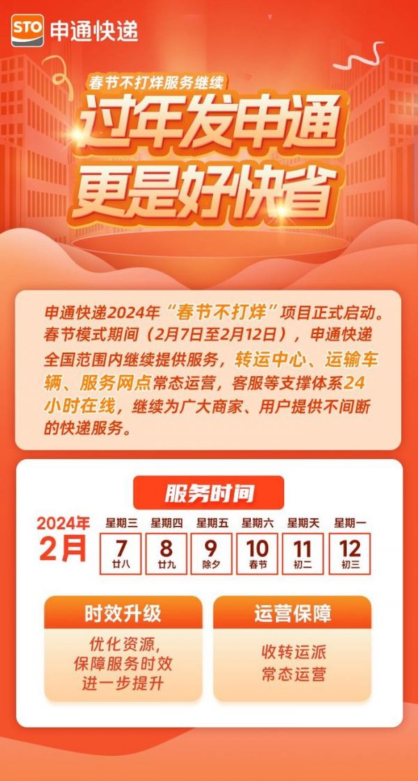 申通方面,2月7日至2月12日,申通在全国范围内继续提供服务,转运中心、运输车辆、服务网点常态运营,客服等支撑体系24小时在线,继续为广大商家、用户提供不间断的快递服务。