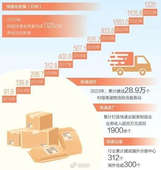 数据显示,2023年,我国邮政行业寄递业务量完成1620亿件,同比增长16.5%。其中,快递业务量和业务收入分别完成1320亿件和1.2万亿元,同比分别增长19.5%和14.5%,再创历史新高。