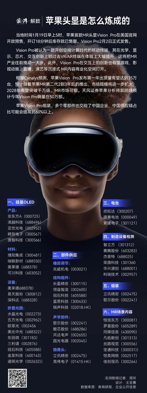 国盛证券列出的Vision Pro 相关标的:整机:立讯精密(002475)、歌尔股份(002241)、华勤技术(603296)、亿道信息等(001314);零部件:舜宇光学(02382.HK)、水晶光电(002273)、兆威机电(003021)、高伟电子(01415.HK)、长盈精密(300115)、东山精密(002384)、鹏鼎控股(002938)、京东方(000725)、德赛电池(000049)、欣旺达(300207)、领益智造(002600)、三利谱(002876)、国光电器(002045);设备:杰普特(688025)、深科达(688328)、华兴源创(688001)、智立方(301312)、博硕科技(300951)等。