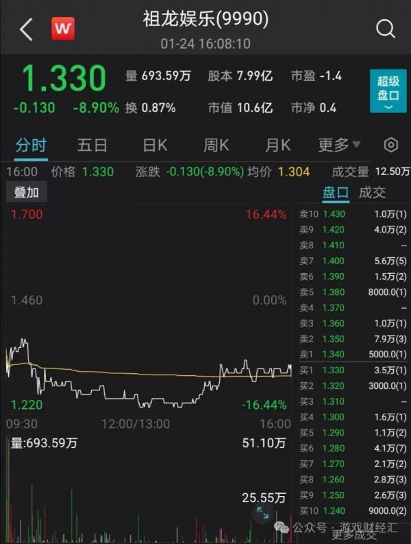 次日(1月24日),受该消息影响,祖龙娱乐股价大跌8.9%,市值跌至10亿左右。