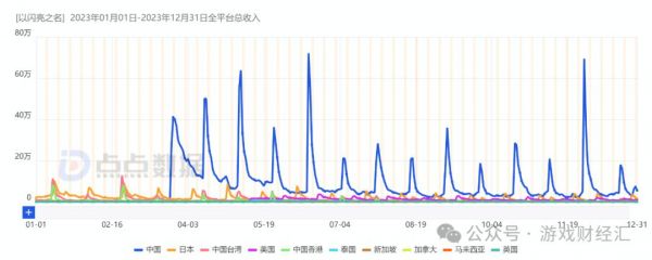根据点点数据预估,2023年《以闪亮之名》全球双端收入达4568.1万美元(折合约3.28亿人民币)。分地区来看,中国大陆收入占比63.58%,是第一大市场,日本位列第二(14.60%)、中国台湾第三(6.35%)。