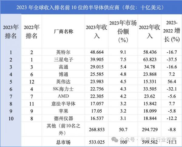 而2023年排名前25位的半导体厂商的半导体营收合计下降14.1%,占市场份额为74.4%,低于2022年的77.2%。排名前25的半导体供应商中,只有9家实现了 2023 年收入增长,其中10家出现了两位数的下降。