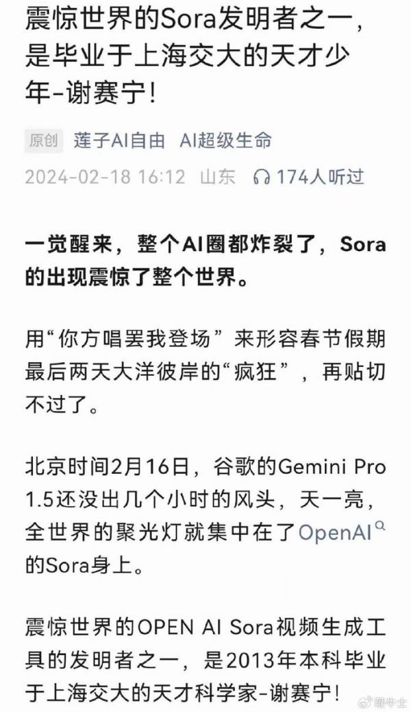 鞭牛士报道,2月19日消息,针对有AI自媒体报道称震惊世界的Sora发明者之一是毕业于上海交大的天才少年谢赛宁,谢本人在朋友圈对此做出了回应。