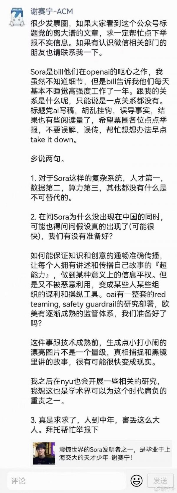 谢赛宁称,Sora和他一点关系都没有,相关媒体胡写,胡乱挂钩,误导事实,对此进行了否认。