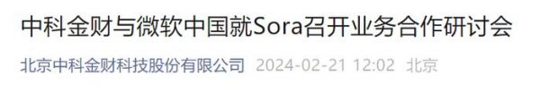 2月21日中午,中科金财在官微上发布与Sora概念相关的重要消息。