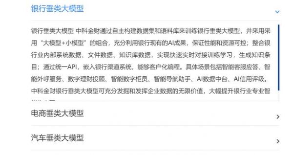 金融行业中,银行是中科金财的一个重要收入客户群体。从该公司官网发布的业务线对应产品看,分为银行垂类大模型、电商垂类大模型、汽车垂类大模型。