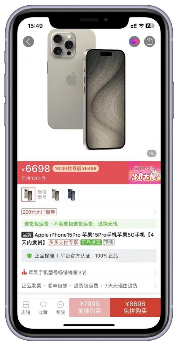 (图源:雷科技摄制)判断旗舰手机竞争力的一大关键在于价格的稳定性。而iPhone 15系列的价格在发售后不久就破发。去年双十一前,在第三方电商平台上,消费者就能以比官网定价低几百上千的价格买到iPhone 15系列的各款机型。进入2024年,iPhone 15系列降价的脚步仍然未停息,比如iPhone 15 Pro券后最低到手价只要6498元,降幅超过了1500元。
