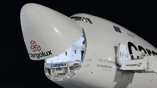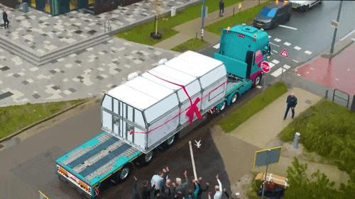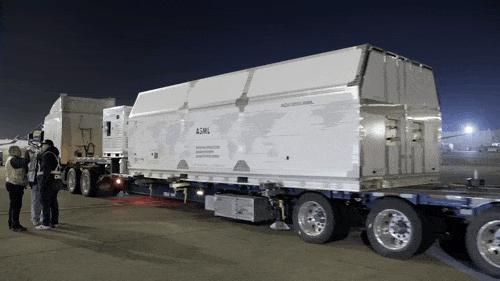 视频显示,一架货机将集装箱从荷兰运输到美国俄勒冈州波特兰,然后由一辆运货卡车运送了该设备的关键部件。