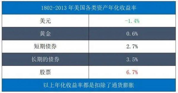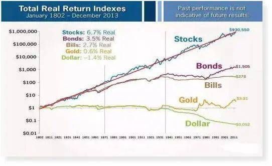 下图是“美国过去200年不同资产投资回报率”,时间跨度是从1802年到2013年: