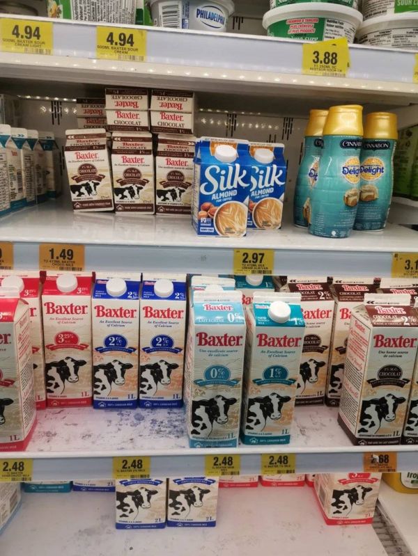 牛奶是鲜牛奶,最大包装4升牛奶8.3加元,每升2加元多点。成都某生鲜电商的鲜牛奶1升8元,略便宜一些。