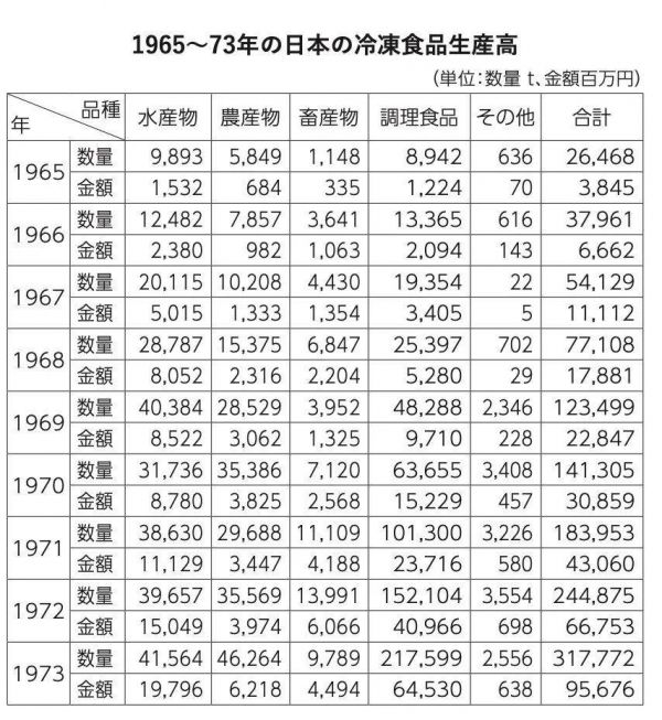 1965~73年日本冷冻食品产量、销售额图表 图片来源:《ニチレイ75年史》