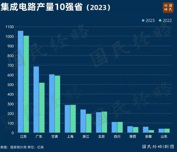 在集成电路产业,甘肃有着一席之地,令许多人感到吃惊。2023年,甘肃集成电路产量604亿块,仅次于江苏、广东,位居全国第三。