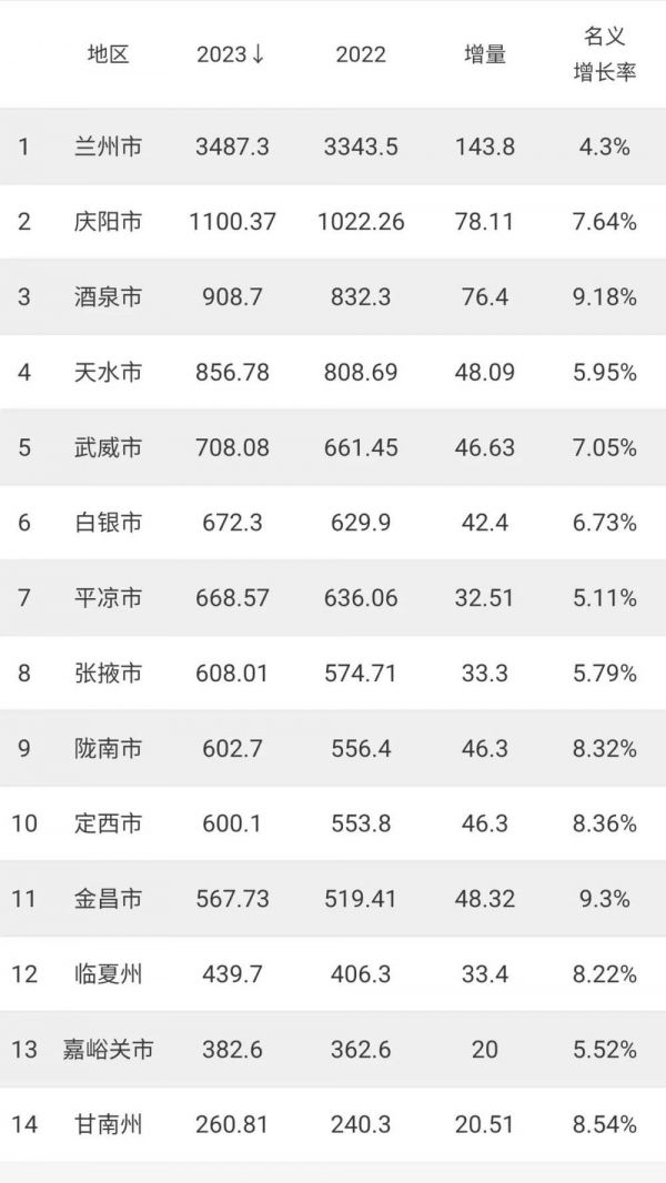 甘肃下辖14个市州,省会兰州是甘肃经济第一大市,2023年GDP总量为3487亿元,在全国排在90名开外,不及陕西榆林、内蒙古包头、四川绵阳等普通地级市。