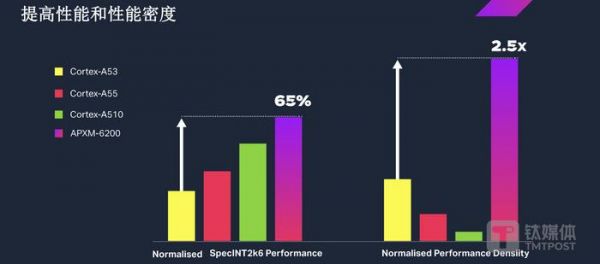 相比Arm Cortex-A53,APXM-6200 CPU在面积效率配置小约25%,但能够提供超过2.5倍(250%)的性能密度提升,在性能、功耗、面积(PPA)方面实现最大化提升。