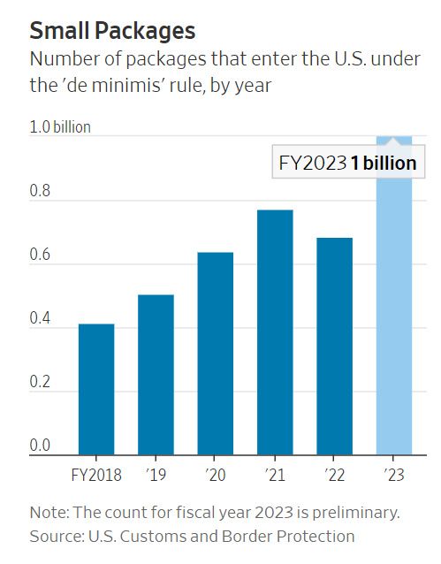 根据美国海关边境保护局(CBP)数据,2018年到2022年,进口小包数量从4.105亿件,飙升至6.851亿件,2023年更是破了10亿件。美国政府估计,来自中国的商品约占60%。