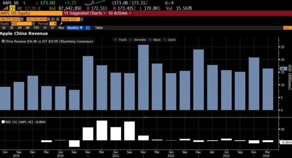 分区域来看,苹果第二财季在其第三大市场——大中华区的营收为163.72亿美元,尽管与去年同期的178.12亿美元相比大幅下降8%,但要优于市场预期的两位数百分比降幅。在财报发布前,华尔街曾悲观地认为这一数字可能同比下降11%至158.7亿美元。