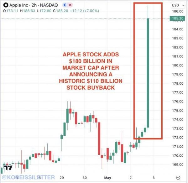 5月2日美股收盘后,苹果发布了该公司2024财年第二财季的财报业绩。财报显示,在截至3月底的第二财季中苹果的营收和利润表现均超过华尔街预期,大中华区销售额的降幅也并不如人们此前担忧的那样大。同时,苹果公司董事会还批准了一项史上最大规模的股票回购计划。受此财报提振,苹果股价在5月2日盘后一度大涨了约7%。
