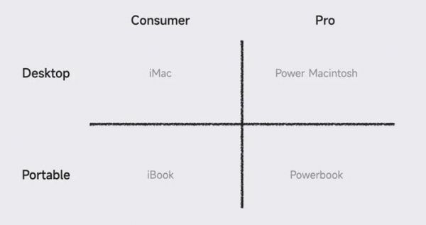 1997年,乔布斯重返苹果划定的产品规划四象限当时苹果距离破产也就还有不到90天的时间。