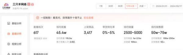 蝉妈妈数据显示,近30天内,除今日外,“三只羊网络”每日直播,日均观看人次165.1万,日均销售额100万至250万。销售额于9月1日达到750万元至1000万元的高峰,其后逐渐走低,16日销售额10万至25万元。从数值来看,半个月骤降九成以上。