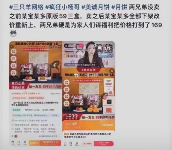 更离谱的是,有网友指出,这款月饼在某电商平台上的原价仅为59元三盒,但被“三只羊”标价169元三盒。一时间,李先生的内疚感愈发加重,