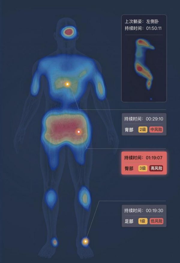 "矩侨关怀"系列产品监测示意图;受访公司供图根据前期市场调研情况," 矩侨关怀 " 系列布局了三款新产品:CARE、CARE+、CLOUD,三者的功能依次叠加、应用场景依次丰富。其中,CLOUD 系列能够感知褥疮风险点,并通过针对性的气囊调节实现自动翻身护理,进一步提升护理便利性。