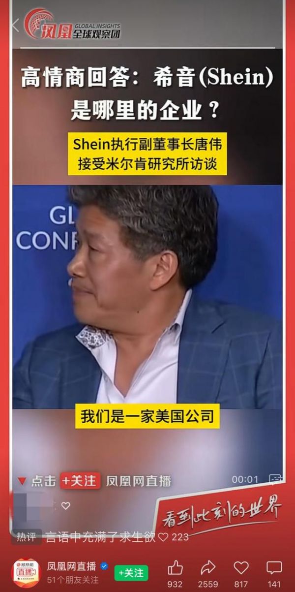 今年5月,在美国米尔肯研究院全球大会上,主持人对话环节,向唐伟抛出了同样的问题:“SHEIN是一家中国公司吗?”