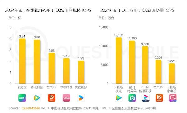 根据QuestMobile的数据显示,截至8月份,拥有超过千万月活跃用户的APP数量已经达到了319个。月活跃用户规模排名前五的在线视频APP分别是爱奇艺、腾讯视频、芒果TV、哔哩哔哩和优酷视频。