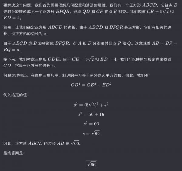更离谱的是,它得出的结论是正方形 ABCD 的边长是 9,而我问的是 AB 的边长;于是,我指出了这个错误,要求重新计算,这才得到一个和通义千问类似的答案。