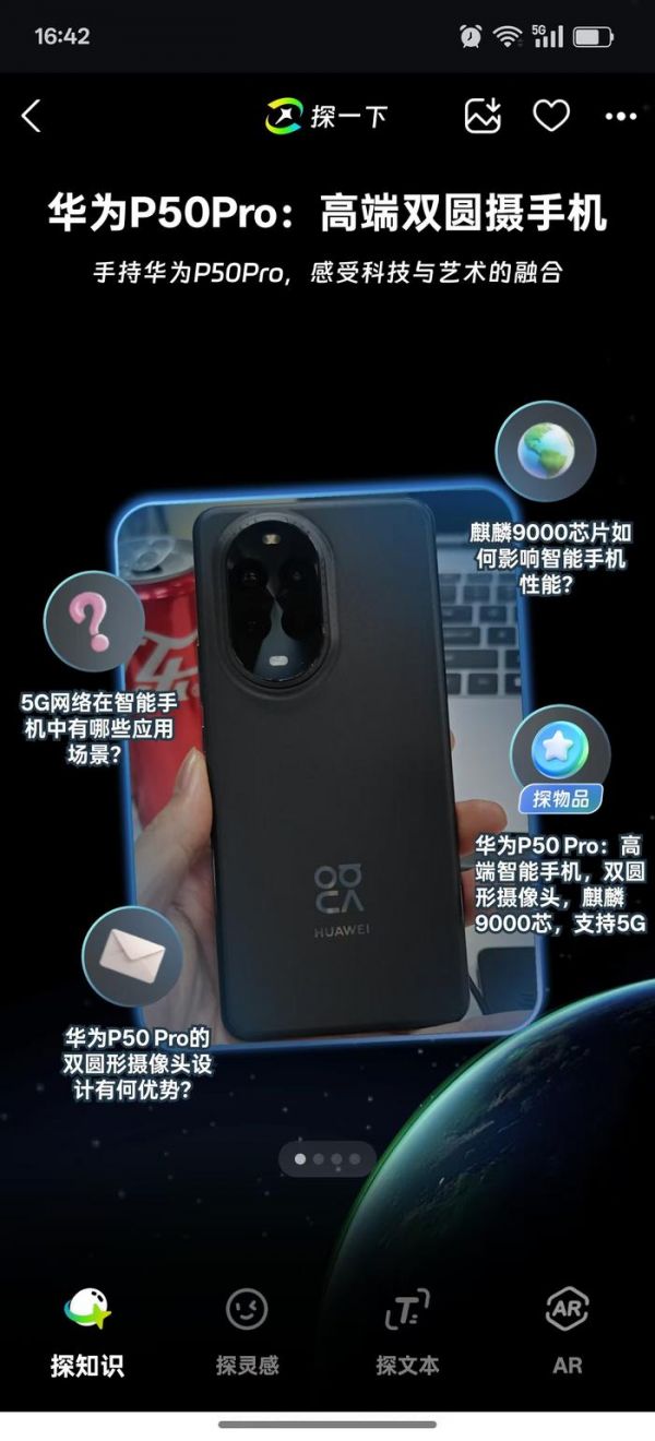 功能划分上,“探一下”主要有“探知识”“探灵感”“探文字”“AR”四个选项,最后两个其实是常规的文字识别和AR显示,小雷认为前两个功能才是“探一下”的核心能力所在。