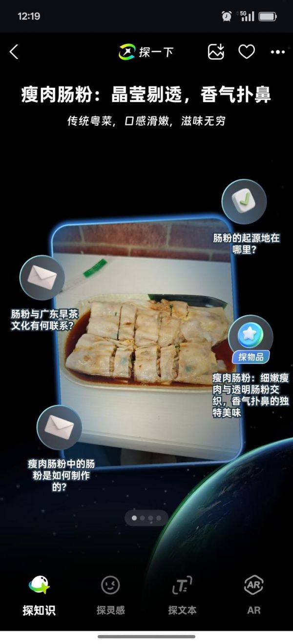 和常规的视觉识别大模型APP不一样,“探一下”在生成识别结果之后会进一步发散,识别的范围很大,绿植、饮料、食物等都可以识别。比如小雷识别了眼前的肠粉之后,“探一下”会基于识别结果提供额外的生成选项,例如“肠粉的起源地”“肠粉与广东早茶文化有何联系”之类的。个人感受来说,如果当下小雷遇到从未见过但又很好奇的事物,“探一下”的探知识能力的确会是一种相对有效的引导。