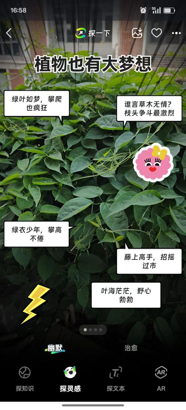而“探灵感”则类似于看图配文,提供“幽默”和“治愈”两种文本生成风格,前者会以漫画对话气泡展现,有点像是物品的“内心OS”之类的,看起来还算有趣,“治愈”就是正能量文本输出,这些文本内容都是基于AI对画面内容识别之后延伸出来的答案,把视觉识别与AI帮写结合在了一起。