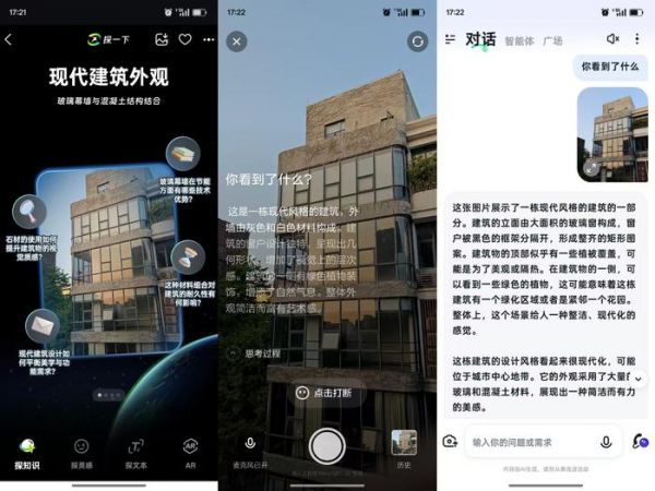 (图片来自雷科技,图一为“探一下”,图二为理想同学,图三为智谱)而“探一下”直接跳过了画面分析这个步骤,直接摆出“石材的使用如何提升建筑物的视觉质感”“玻璃幕墙在节能方面有哪些技术优势”等,来引导我们进一步了解。事实上,对于正在游览景点的人而言,这种发散式的知识科普可能比游园内的讲解器还有用。