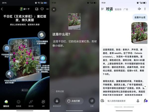识别花花草草,支付宝的“探一下”还是有点实力,和理想同学、智谱的对比当中,“探一下”和理想同学都能准确识别眼前的花卉的品种(千日红),而智谱输出成鸡冠花。实际上千日红和鸡冠花两个品种的颜色比较接近,只在造型上有明显区分,更考验AI对画面内容识别的准确性。