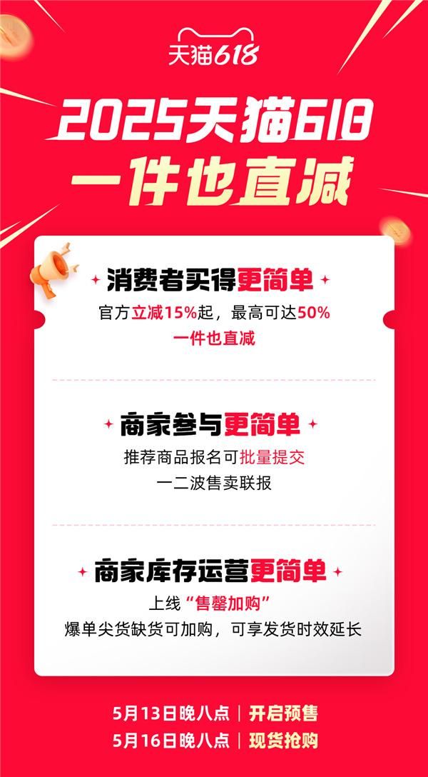 有天猫内部人员透露,今年“618”的核心就是两个“最”:“最便宜、最简单”。除此之外,淘天还准备了“规则补丁”:“最低价校验机制”可以防止商家先涨后降,“售罄加购”则可以提醒商家及时补货,在平台取消预售后,帮助商家承接溢出的消费需求。