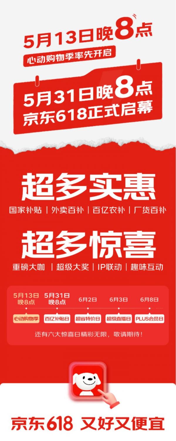 京东则开启了“双大促联动”模式,先以“心动购物季”进行预热,再启动“618”的多个主题活动。此外,京东还将618促销优惠和国家补贴、外卖补贴叠加在一起,让消费者能够享受更多折扣。