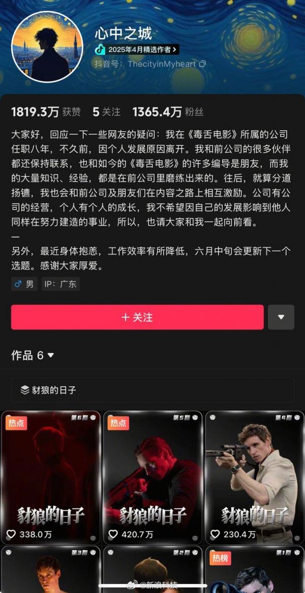 【#短视频账号6条视频涨粉1300万##心中之城回应热议#】近日,一个名为 “心中之城” 的账号以现象级的涨粉速度引发广泛关注,成为影视解说圈新晋IP。该账号仅用6条影视解说视频,便在两个月内狂揽超千万粉丝,创造了抖音影视解说赛道的涨粉纪录。
