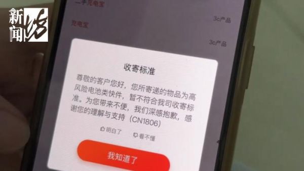 在社交媒体平台,有消费者表示,自己下单寄送被召回的充电宝,订单被退回,系统提示:“您的快件因【违禁品】未揽收成功”。也有网友反映,即便是获得了3C认证的充电宝,目前也难以通过快递寄出。