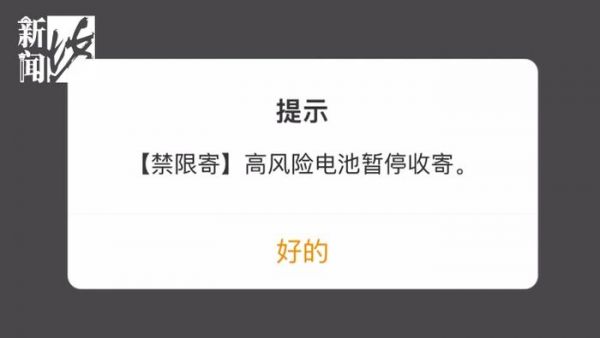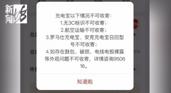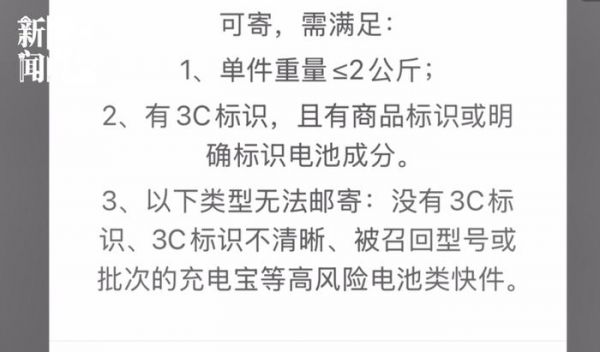 记者注意到,在顺丰速运、EMS中国邮政等多家快递公司小程序上寄件时,物品信息一栏若填写“充电宝”,便会跳出警示信息:因物品为“高风险电池”,暂停收寄。